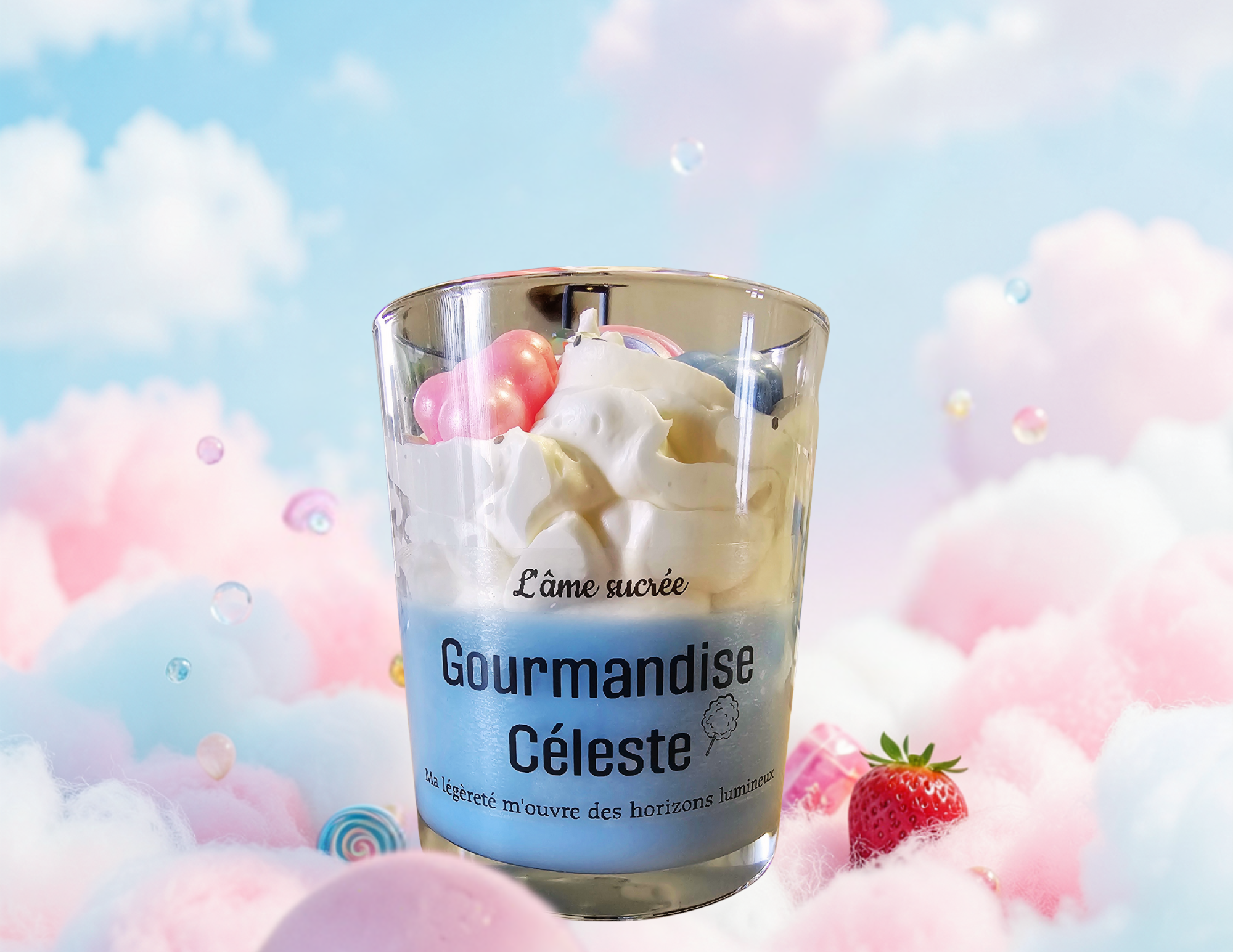 Gourmandise Céleste capture la sensation d’un nuage sucré qui flotte doucement dans l’air. Les premières notes de fraise apportent une fraîcheur fruitée, légère comme une brise rosée. La fleur d’oranger vient ensuite envelopper l’ensemble d’une douceur apaisante, presque cotonneuse.
