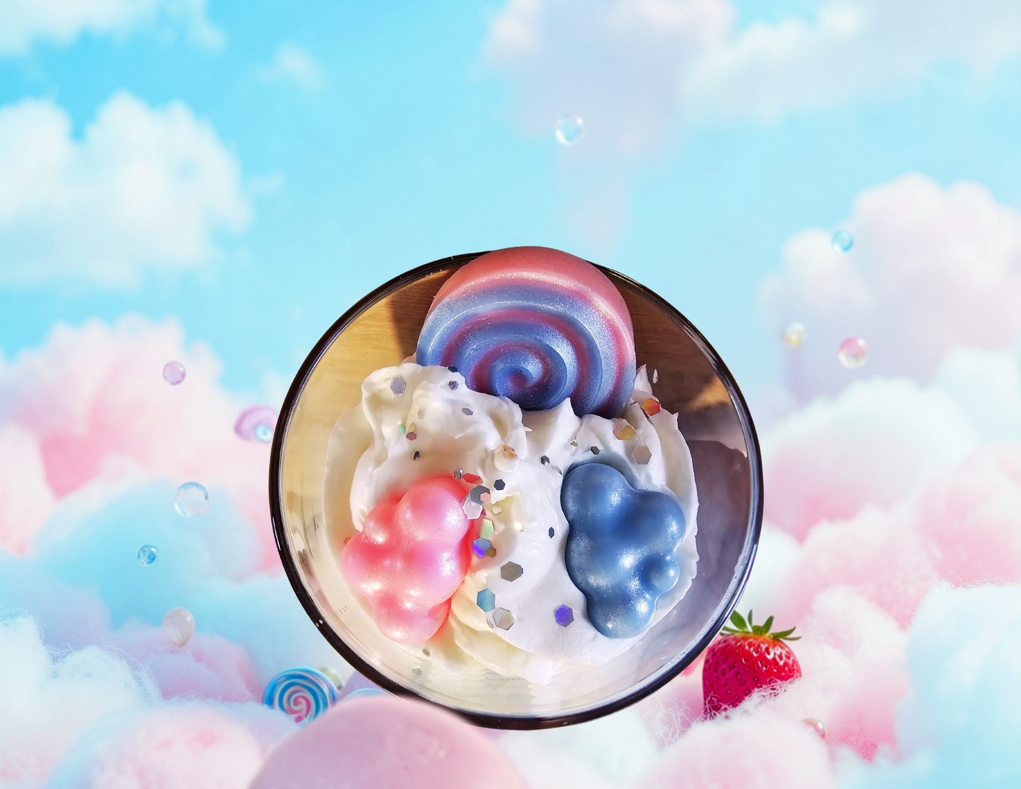 Gourmandise Céleste capture la sensation d’un nuage sucré qui flotte doucement dans l’air. Les premières notes de fraise apportent une fraîcheur fruitée, légère comme une brise rosée. La fleur d’oranger vient ensuite envelopper l’ensemble d’une douceur apaisante, presque cotonneuse.